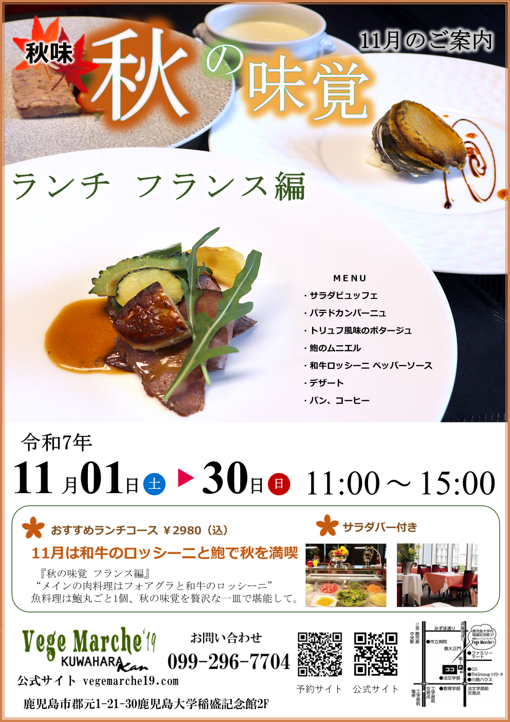 前菜、スープ、メイン料理(お魚料理又はお肉料理)、デザート、パン、コーヒー サラダビュッフェ付き